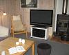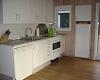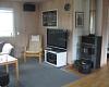 Innen erwartet Sie ein heller Wohnraum, offen verbunden mit Küche und Essbereich. Es gibt eine gemütliche Ecksofa, einen Sessel, einen Fernseher mit Satellitenempfang und einen Kaminofen, der an kühlen Abenden für Wärme und Stimmung sorgt. Die gut ausgestattete Küche bietet reichlich Platz für gemeinsames Kochen und Beisammensein.