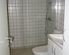 Das Badezimmer ist hell und funktional eingerichtet mit Dusche, Waschbecken, WC und Schränken.
