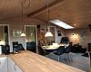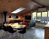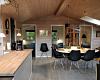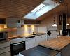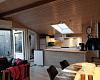 Gepflegte Küche in offener Verbindung zum Wohnzimmer mit Holzofen, Essplatz, Sofagruppe und TV mit Parabol.