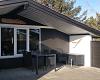 Grosse, geflieste und geschlossene Terrasse, teilweise überdacht mit Gartenmöbeln, 2 Liegestühlen und Grill