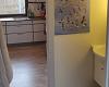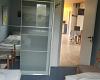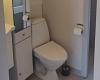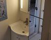 Kleines Bad mit Handwaschbecken, Schrank, WC und separatem Duschabschnitt