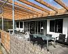 Vom Wohnzimmer aus Ausgang auf eine grosse, überdachte, fast geschlossene Terrasse mit Gartenmöbeln und Grill.