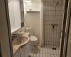 Schönes Bad mit WC, Handwasch in Schrankkombination und Dusche.