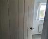 Eingang in einen Vorraum mit Schrank, Gefrierschrank, Waschmaschine, Spülmaschine, Tisch und Platz für Überzeug und Schuhe.