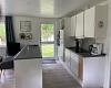 Ausgang von der Küche in einen schönen eingezäunter Garten mit überdachter Terrasse, Gartenmöbeln und Grill.