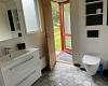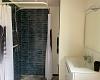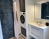 Bad mit WC, Handwaschbecken, Waschmaschine und Dusche.