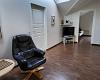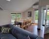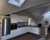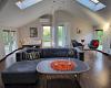 Eingang in einen kleinen Flur mit Platz für Überzeug, grosser heller Aufenthaltsraum mit offener Decke und Dachfenstern.