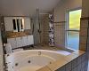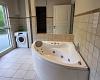Grosses Bad mit WC, Handwaschbecken in Schrankkombination, Dusche, Waschmaschine, Whirlpool und Sauna.