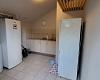 Separater Raum mit grossem Kühl-/Gefrierschrank, Waschbecken und Schrank.