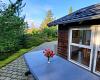 Gepflasterte Terrasse rund um das Haus, Gartenmöbel, Liegestühle und Holzkohle-Kugelgrill.