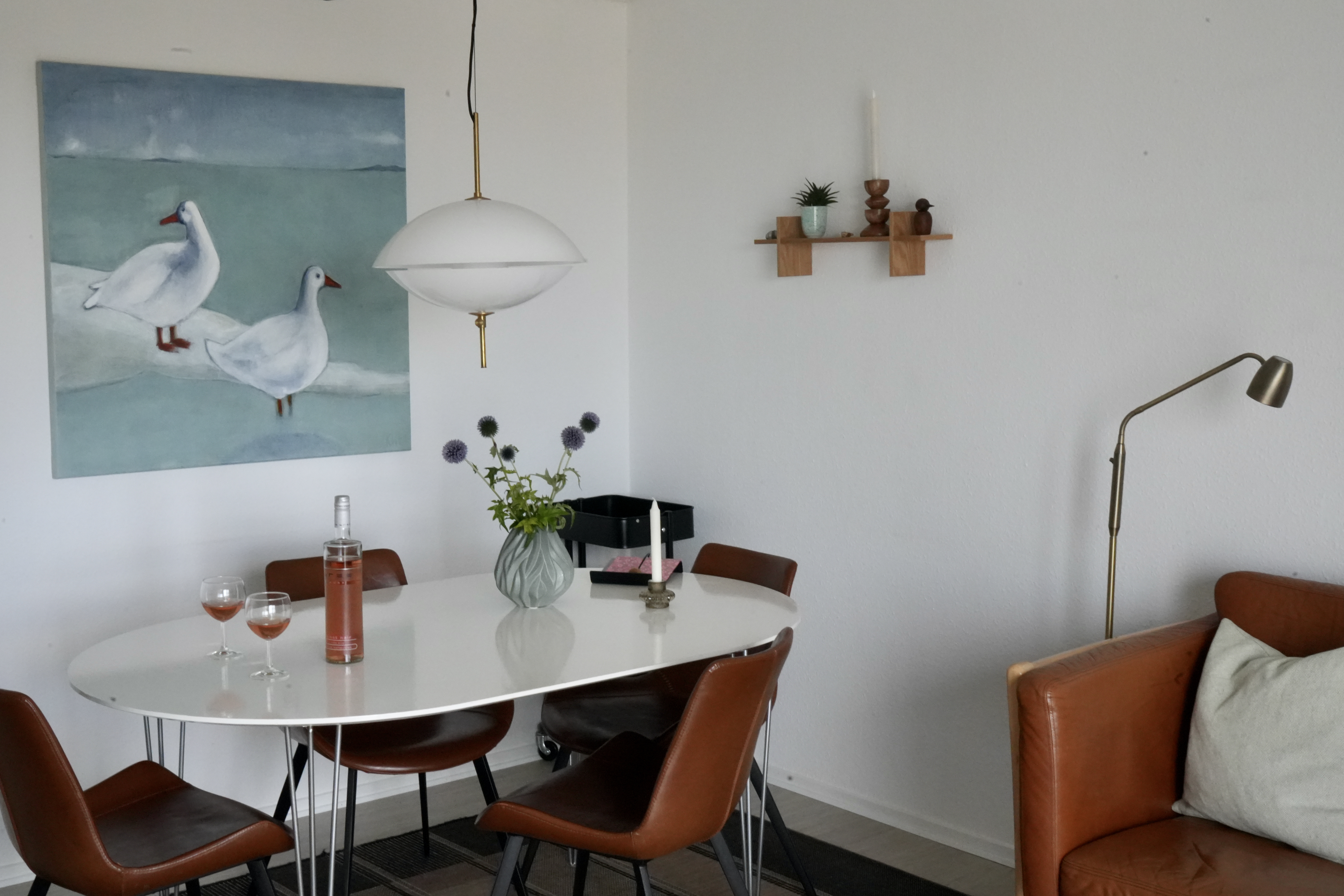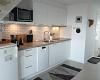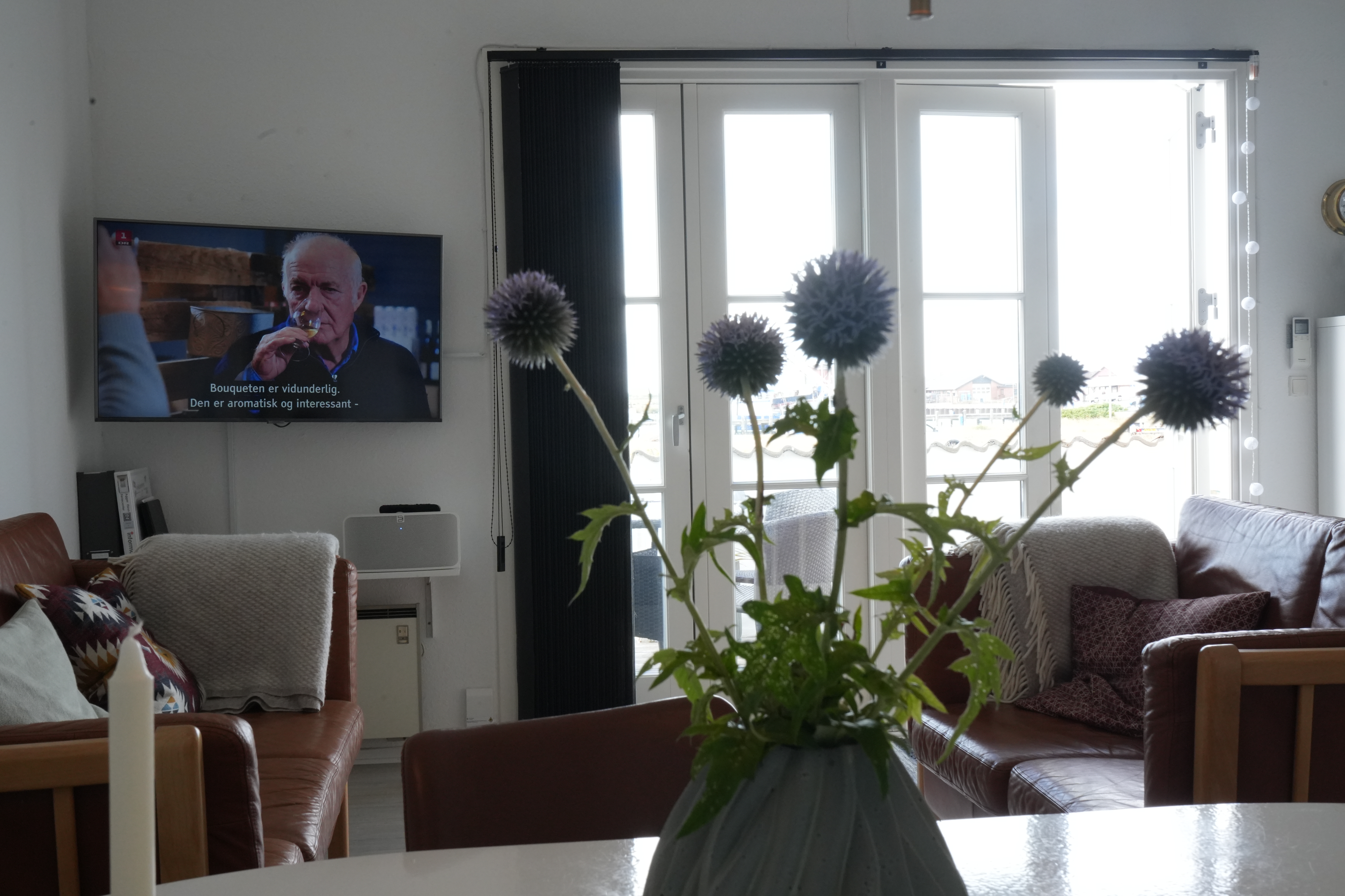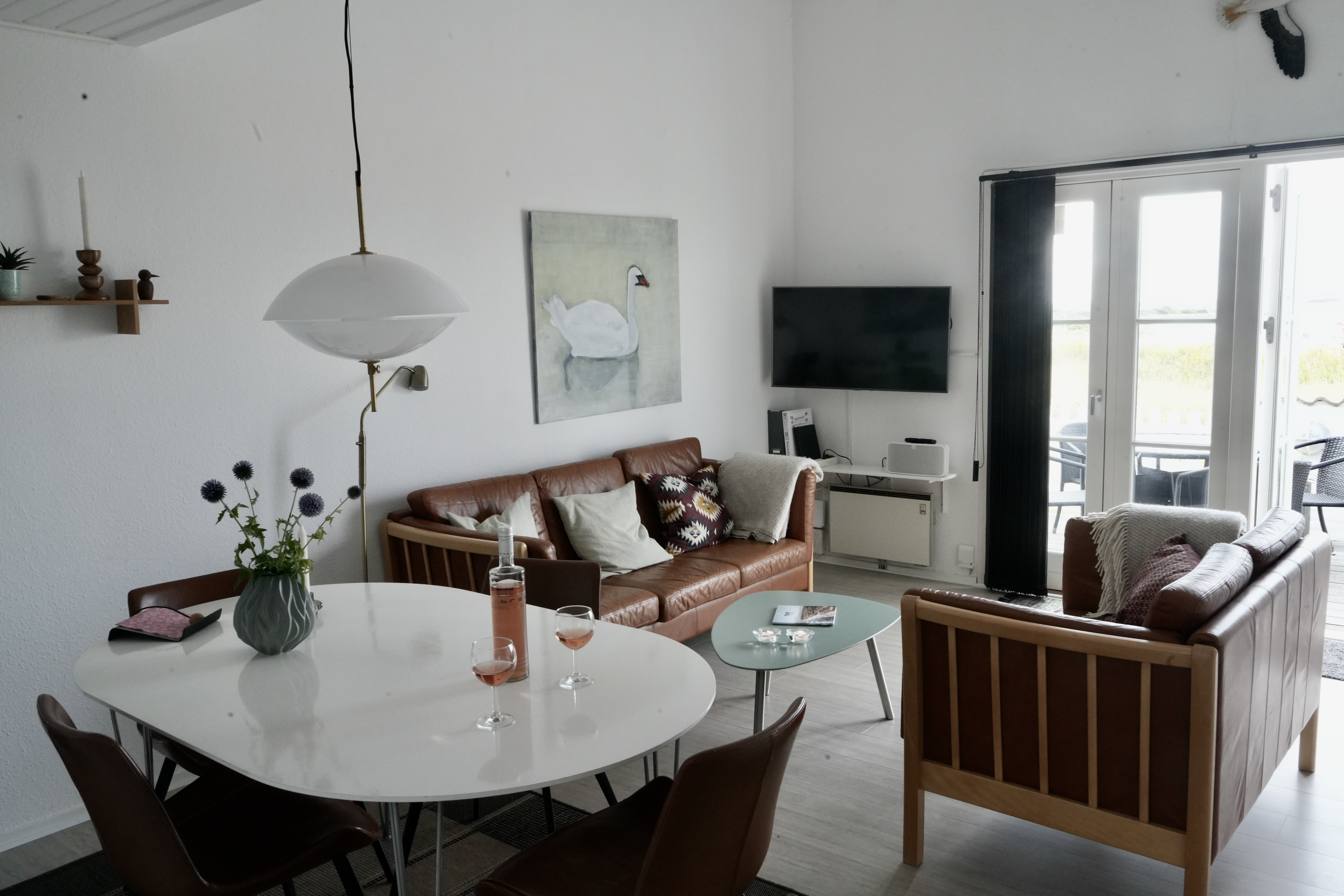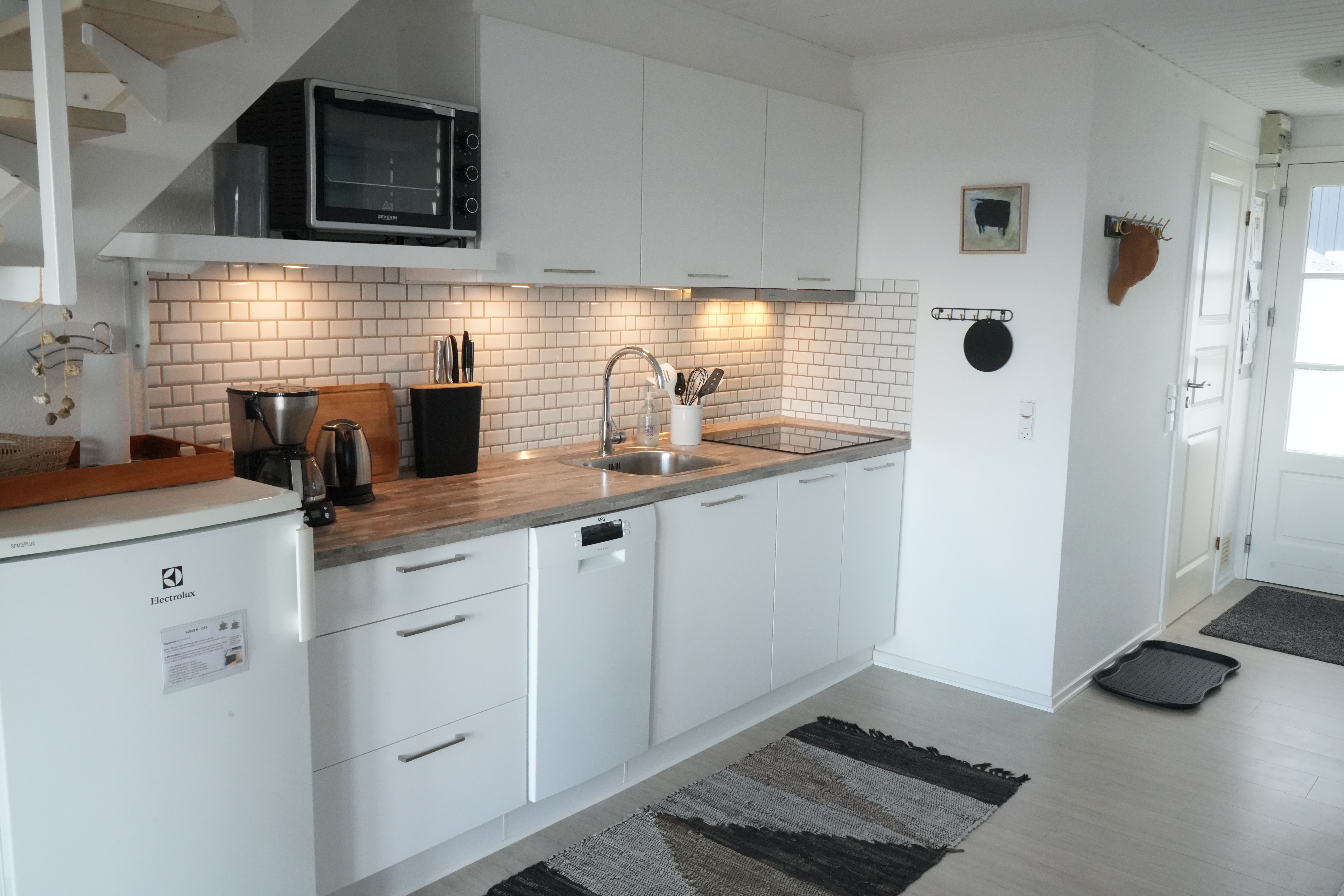 Det flotte, nyere køkken er udstyret med bl.a. opvaskemaskine, kogeplade, mini-ovn og køleskab med lille fryser. Køkkenet ligger i åben forbindelse med den hyggelige stue, som byder på sofagruppe, spiseplads og TV med DR, tyske og nordiske kanaler. Der er gratis WiFi, som giver mulighed for at tilslutte dit eget Apple TV, cromecast etc.