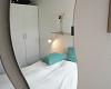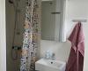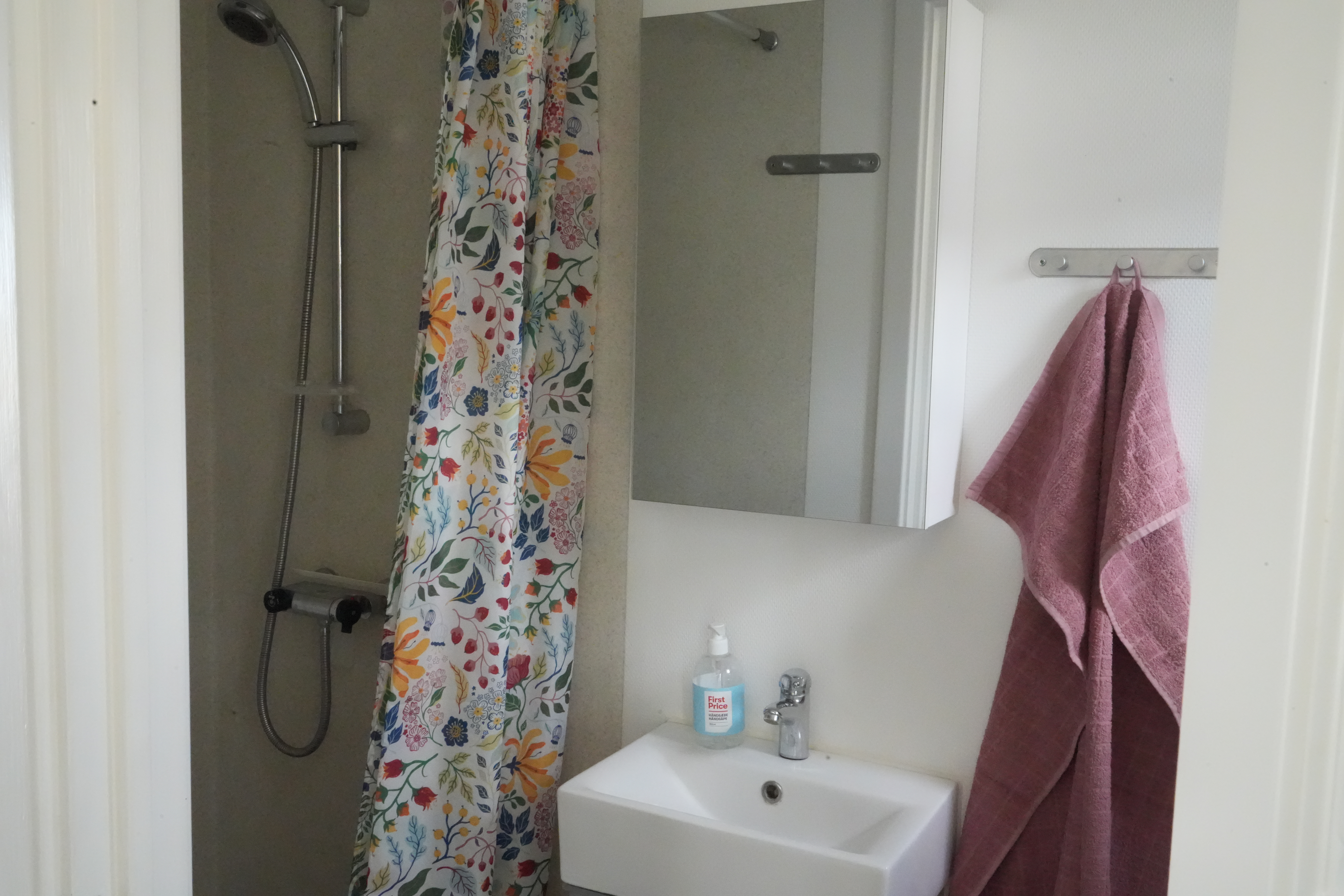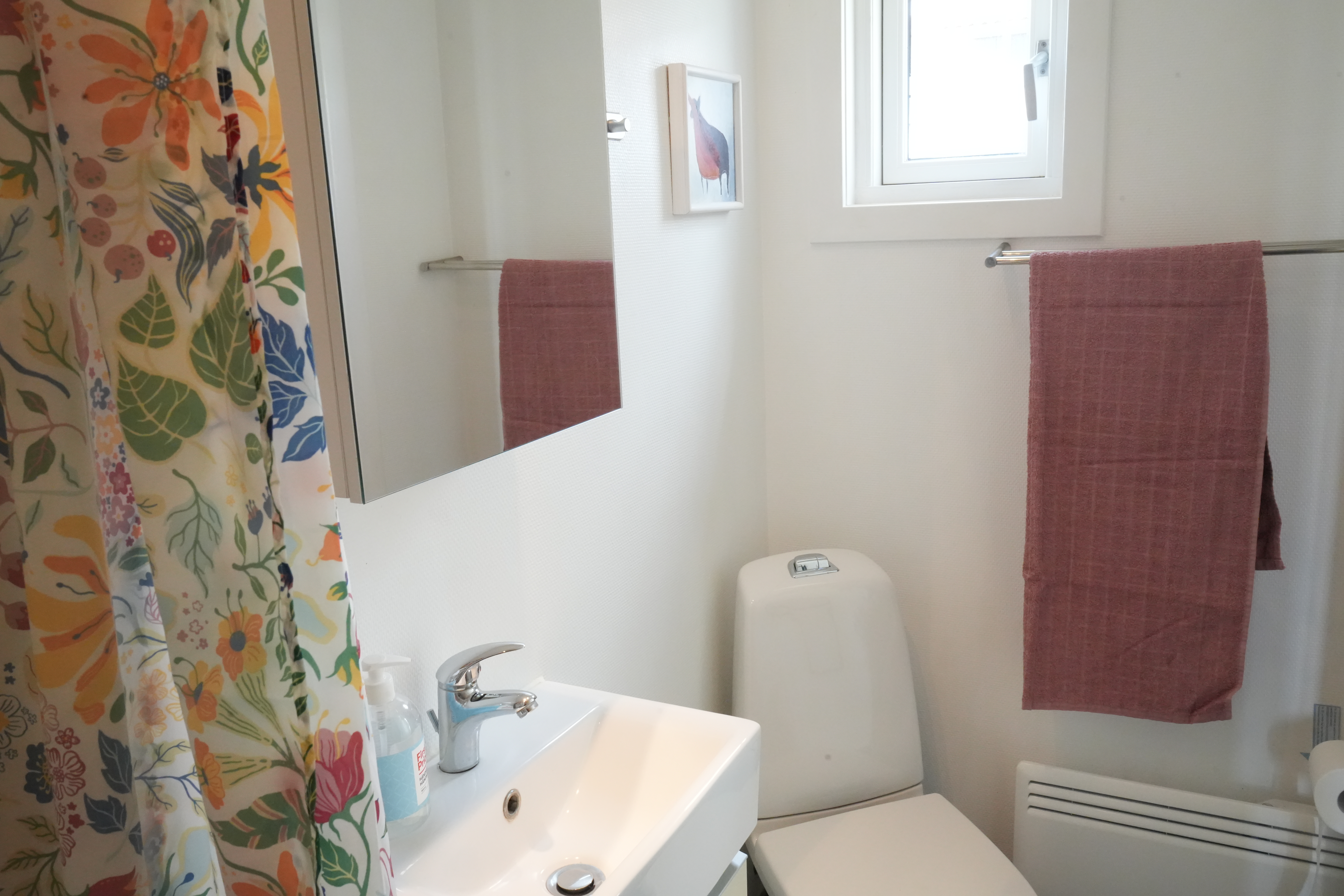 Lejligheden byder på en lys entré og et moderniseret badeværelse med bruseniche, toilet og håndvask i skabsarrangement. I stueplan finder du også et soveværelse med dobbeltseng og gode opbevaringsmuligheder.