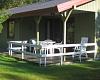 Fra stuen udgang på overdækket terrasse m. havemøbler.