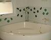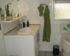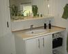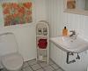 Pænt badeværelse m. spa, sauna, brucheniche og håndvask i skabsarrangement.