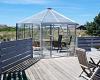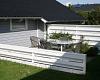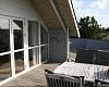 Udgang fra stue til delvist overdækket, sydvest-vendt terrasse med havemøbler, relax stole og grill.