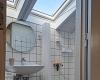 Lille lyst badeværelse med WC, håndvask og bruseniche.