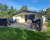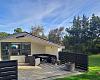 Sydvendt solterrasse, delvis overdækket, med havemøbler, liggestole og grill