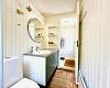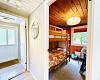 Badeværelset er pænt og funktionelt med bruseniche og skabsplads, og huset opvarmes energieffektivt med varmepumpe, brændeovn og el-radiatorer, så du kan nyde opholdet hele året rundt.
