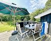Sommerhuset er gennemført hyggeligt og indbydende indrettet med lyse materialer og en dejlig atmosfære. Den store stue byder på brændeovn, komfortable møbler, TV med Chromecast og både danske og tyske kanaler – perfekt til afslapning efter en dag i naturen. Herfra er der direkte udgang til den sydvendte terrasse med havemøbler, liggestole og læ – et ideelt sted at nyde morgenkaffen eller lange sommeraftener.