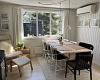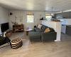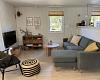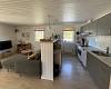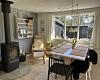 Funktionelt nyere køkken i åben forbindelse med opholdsstue med spiseplads, brændeovn, TV hjørne med sofa og lænestole.