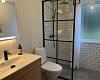 Pænt nyt badeværelse med vask i skabs arrangement, WC og bruseniche.