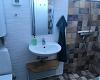 Lille lyst badeværelse med WC, håndvask og bruseniche.