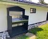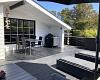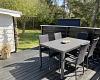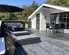 Lukket træ-terrasse, delvis overdækket, med havemøbler, liggestole, loungesæt og grill.