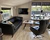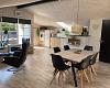 Køkken i åben forbindelse med stue m. brændeovn, spiseplads, sofagruppe i læder og TV m. Chromecast og parabol.