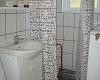 Lille badeværelse m. WC, håndvask, bruseniche og vaskemaskine.