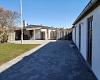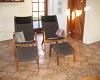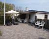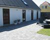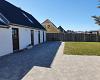 Udgang fra stuen til stor dejlig lukket have/terrasse med havemøbler, liggestole og grill.