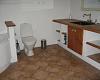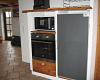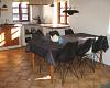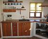 Pænt køkken i åben forbindelse med spisestue og TV-stue med brændeovn.