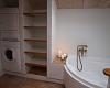Rummeligt badeværelse med WC, håndvask i skabsarrangement, vaskemaskine, bruseniche og badekar.