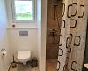 Pænt nyt badeværelse m. WC, håndvask i skabsarrangement, bruseniche.